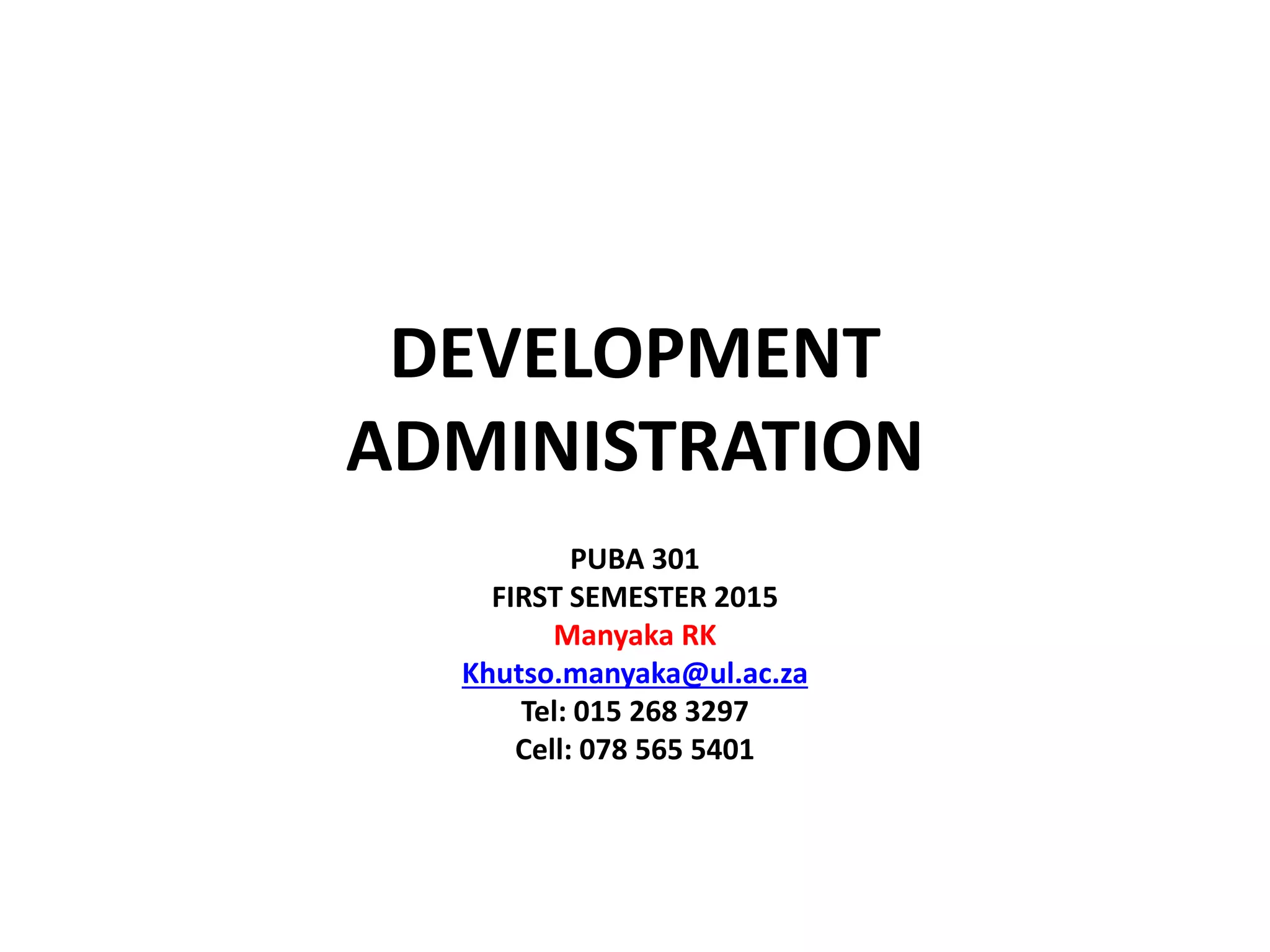 This document provides information about an assignment for a Development Administration course. It includes details about the assignment such as specifications of a 20 page paper on the origins of the developmental state concept. It also lists learning outcomes which are to understand the meaning and theories of the developmental state and describe its features and relevance. The document then discusses concepts related to development administration such as meanings, facets, elements, and the importance of planning, goal-orientation, and management capacities.