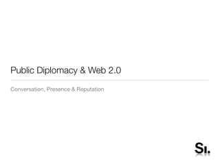 The document discusses strategies for public diplomacy in the age of Web 2.0, including managing conversations online, maintaining an omnipresent online presence, and protecting one's reputation. It also provides lessons learned from the Second House of Sweden virtual embassy in Second Life, such as focusing on social engagement rather than replicating the real website and obeying local customs. Future plans for the Second House of Sweden include hosting discussions, art exhibits, music performances, and mixed reality experiences to showcase Swedish culture online.