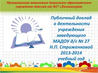 Публичный доклад МАДОУ детского сада №27 Калининграда за 2013-2014 учебный год включает информацию о структуре и деятельности учреждения, количестве групп и детей, а также педагогическом составе. В отчете подчеркнуты достижения в области коррекционной работы, организованного питания и безопасности детей, а также планы по улучшению образовательных услуг и материально-техническому развитию на следующий год. Особое внимание уделено внедрению инновационных методов обучения и взаимодействия с семьями воспитанников.