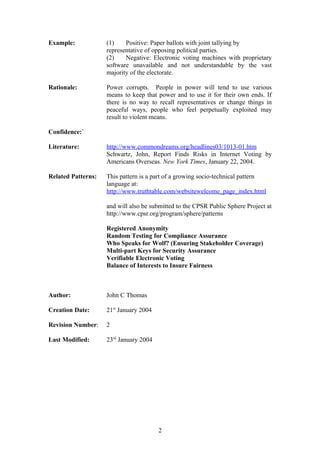 This document outlines a pattern called "Public Accountability for Public Decisions made Privately" to address how voting processes can balance private voting with public accountability. The key points are: (1) Voting must be private to prevent intimidation but processes for recording, tallying and reporting votes must be public and understandable. (2) The design and oversight of voting processes should balance opposing political interests to ensure credibility. (3) Paper ballots with joint tallying by representatives of opposing parties is a positive example, while proprietary electronic voting is negative.