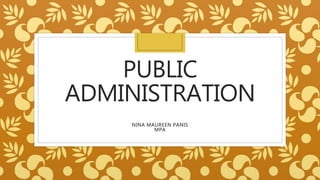 Public administration involves the implementation of government policies and operations, including planning, organizing, directing, coordinating, and controlling government work. It has evolved over time from focusing on separating politics and administration, to emphasizing principles of administration and efficiency, to considering human factors and incorporating other social sciences. Public administration is significant as the key instrument of government to maintain order and protect citizens. It also enables development, supports modern welfare states by providing public services, and is an important subject of academic study.