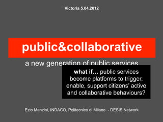 This document summarizes a presentation by Ezio Manzini on public and collaborative services. It discusses how public services could become platforms to enable and support citizens' active, collaborative behaviors. It provides examples of social innovations like community gardens and circles of care that blur roles between users and providers. The presentation argues that a new design paradigm is emerging that designs for active people and communities to shape their own lives. It also discusses how the global crisis may impact social innovation and how a new political awareness of social innovation is emerging worldwide.