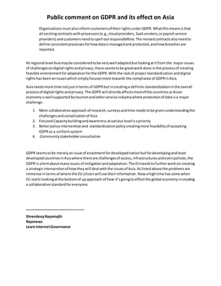 The document discusses the impact of the GDPR on Asia, highlighting the region's diverse economies and unique challenges regarding data protection and compliance. It outlines key issues such as lack of standardization, the need for capacity building, and the complexity of implementing GDPR regulations. The author emphasizes the necessity for collaborative approaches and tailored policy interventions to address the specific challenges faced by developing and least developed countries in Asia.