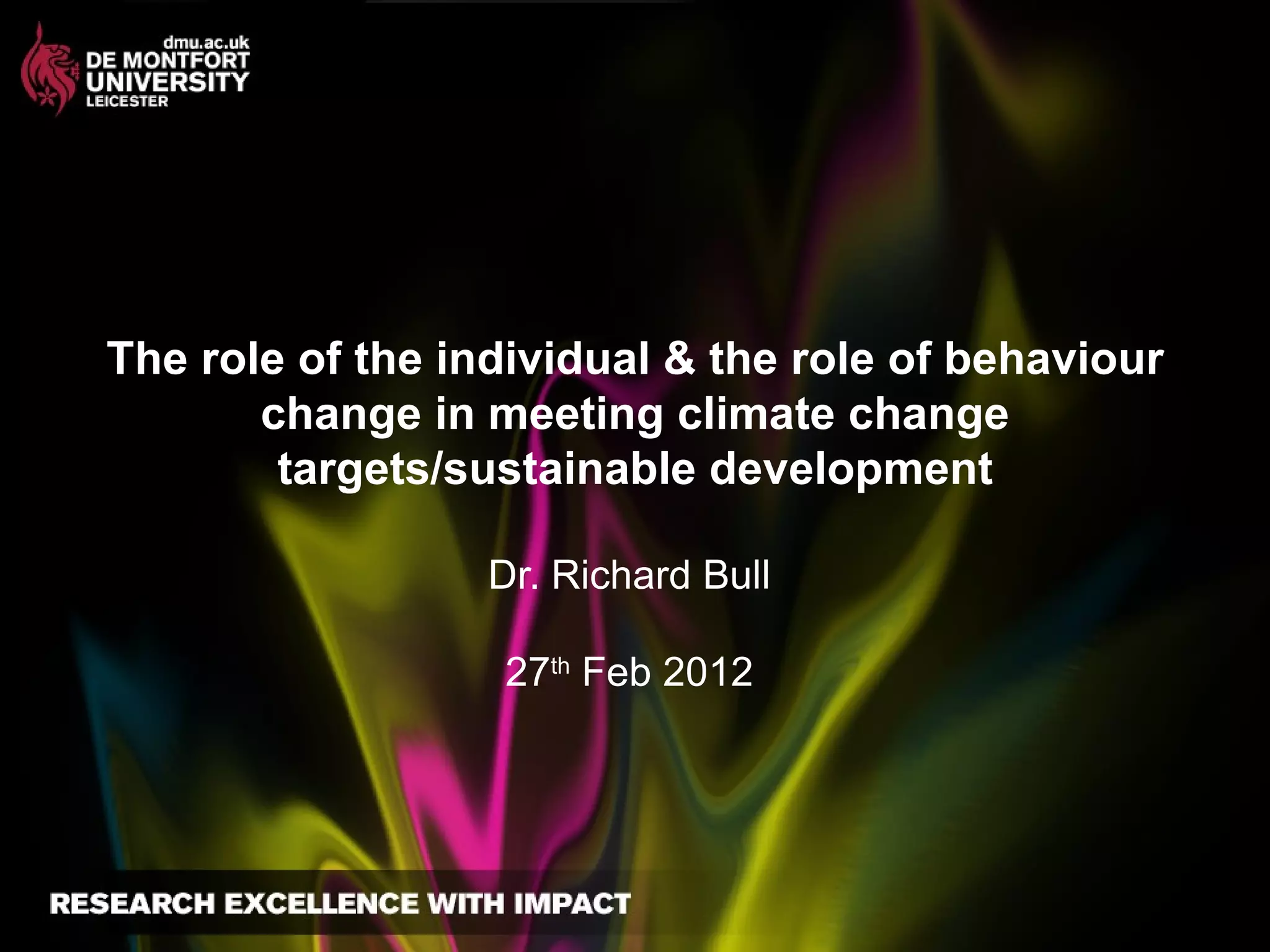 The document discusses the role of individuals and behavior change in meeting climate change targets. It examines two examples - reducing household waste through public engagement in Hampshire, and reducing energy use in public buildings through the Display Energy Cities campaign. Both examples showed that a partnership approach using deliberative public engagement and learning can facilitate behavior changes needed to achieve environmental goals.