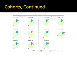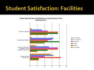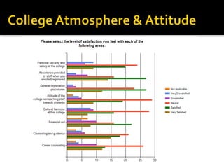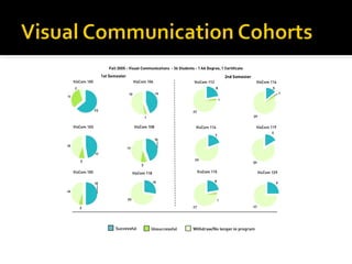 The document discusses a program review covering topics like enrollment trends, student satisfaction survey results, technology usage, and copyright issues. It examines factors like full-time equivalent students, average class size, student satisfaction with educational methods and treatment by staff, and areas needing improvement like computer labs and facilities. Suggestions are sought for the program.