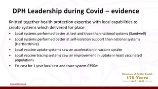 The document discusses the role of public health leadership during the COVID-19 pandemic, highlighting the effectiveness of local systems in health protection compared to national systems. It outlines the challenges faced, such as fragmentation in the English health protection system and the need for clear roles for Directors of Public Health (DPH) in local systems. Additionally, it lists critical success factors for public health leadership, emphasizing the importance of local governance, adequate funding, and collaboration.