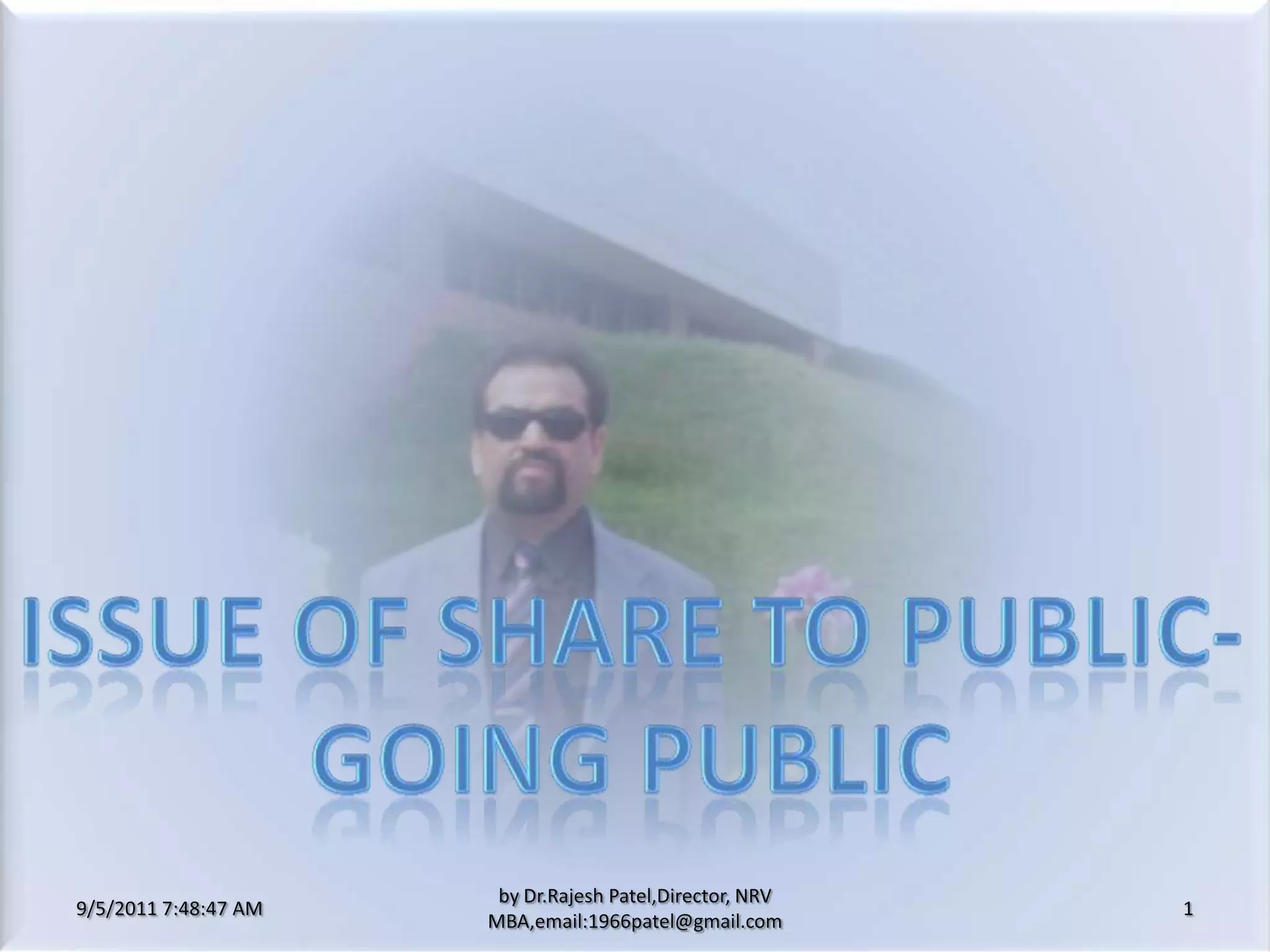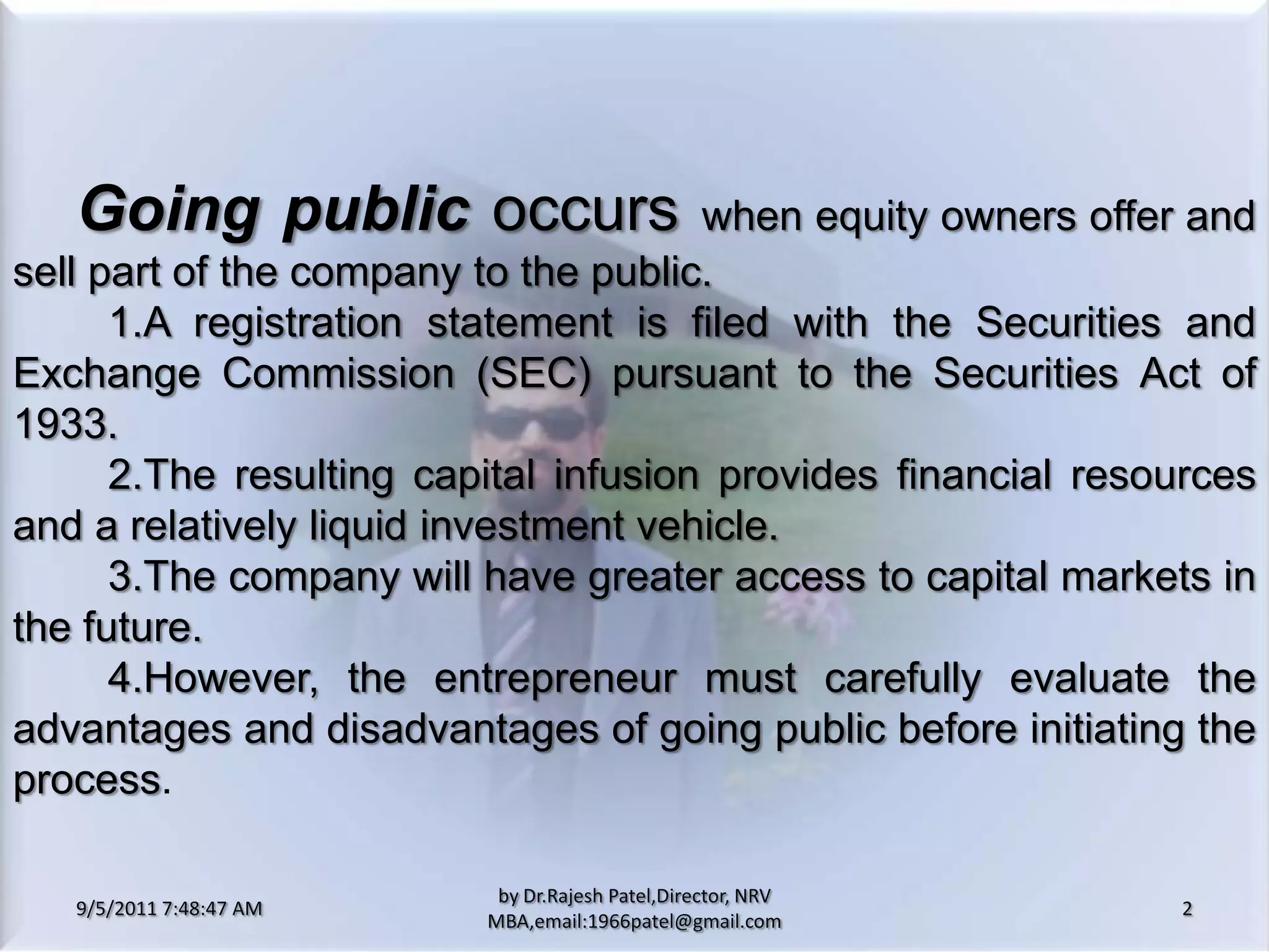 This document discusses going public and the process of issuing shares to the public for the first time. It describes filing a registration statement with the SEC, the capital raising benefits for the company, and also the loss of control and increased administrative burdens that come with being a public company. Private placements and bank loans are presented as alternatives to going public. Key considerations for timing an IPO and selecting an underwriter are also outlined.