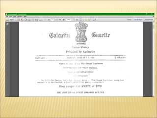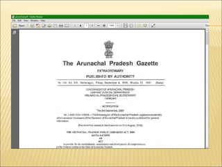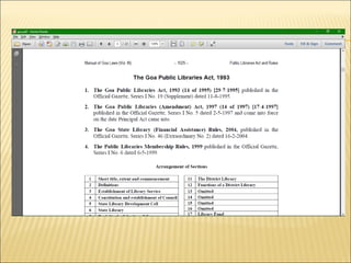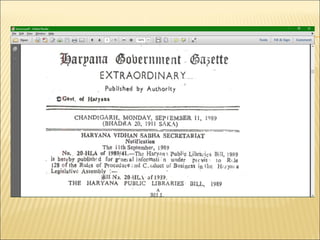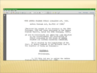 Library legislation is intended to provide a legal framework and adequate financial support for public libraries. Various Indian states have passed public library acts between 1948-2009, which establish funding sources like property taxes, land revenue taxes, alcohol taxes, and house taxes to support public libraries. The document provides a timeline of the years different states in India passed public library acts.