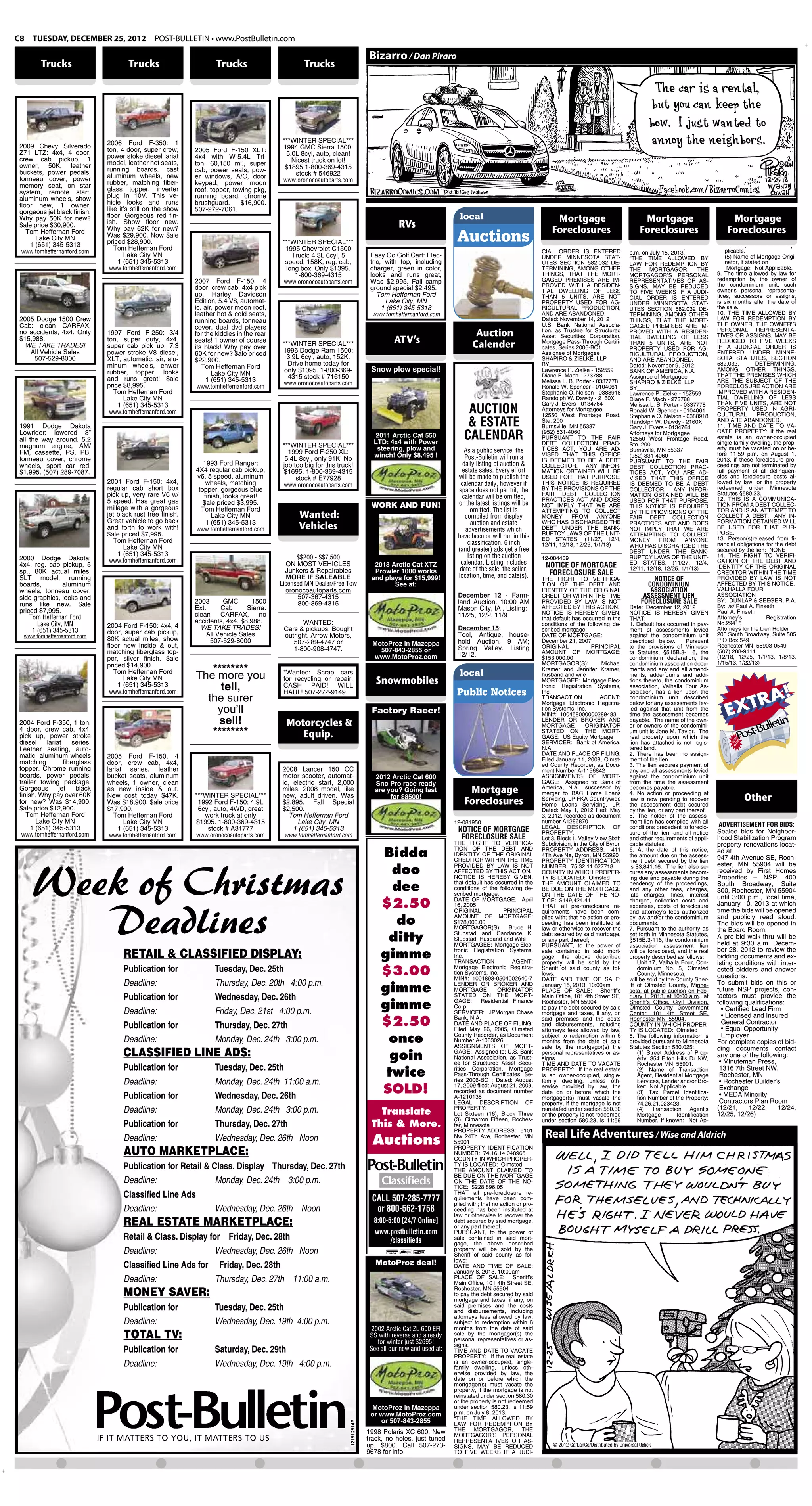 This document consists of classified advertisements for vehicles for sale from Tom Heffernan Ford dealership in Lake City, MN. It includes over 15 vehicles ranging from trucks to cars priced between $1,000-$30,000. It also includes advertisements seeking vehicle purchases and listings for upcoming auction and estate sales in the area.