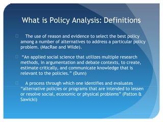 This document provides an overview of public policy analysis. It defines policy analysis as using evidence and reason to select the best policy among alternatives to address a problem. The summary discusses three key points: