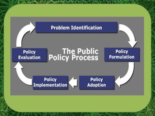 The document discusses key concepts related to public policy including definitions of public policy, the aims and nature of public policy, and the policy-making process. It outlines the major steps in the policy-making process including agenda setting, policy formulation, implementation, and evaluation. It also discusses the roles of different players and advocacy in shaping public policy. Lastly, it provides an overview of the legislative process in the Philippine government.
