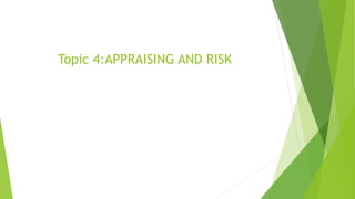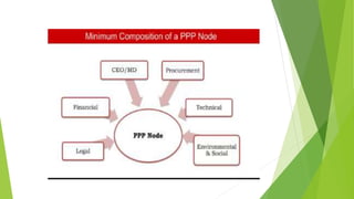 This document provides an overview of project appraisal and risk management for public-private partnerships (PPPs). It discusses the importance of the framework guiding PPP projects from identification through the project lifecycle. Key aspects of project appraisal covered include screening projects for PPP suitability, economic viability analysis, cost-benefit analysis, and risk assessment. The stages of the PPP process and differences between PPP and traditional procurement are also summarized.