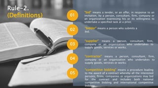 The document defines key terms related to public procurement rules in Pakistan. It defines bid, bidder, competitive bidding, supplier, contractor, emergency, e-Procurement, framework agreement, most advantageous bid, repeat orders, call off order, unsolicited project proposal, value for money, blacklisted, cross debarred, and corrupt and fraudulent practices. It also outlines some basic principles of procurement, including conducting procurements in a fair and transparent manner and ensuring value for money. The scope and applicability of the rules are described, along with provisions for international commitments superseding the rules.