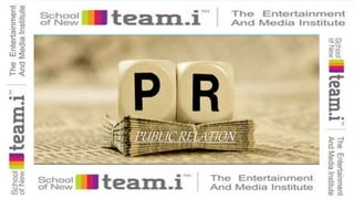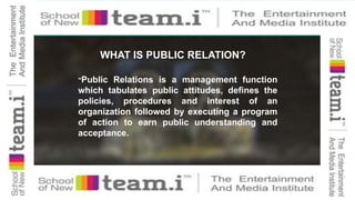 Public relations is the management of communication between an organization and its key audiences to build and maintain a positive image. It involves evaluating public opinions, formulating communication policies, coordinating programs, and fostering goodwill through two-way communication. The aim of public relations is to persuade audiences like the public, investors, partners and employees to maintain a certain viewpoint about the organization through activities like speaking at conferences and working with the press. Some of the major functions of public relations are community relations, employee relations, product public relations, and financial relations.