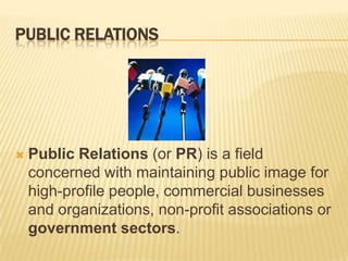 Public relations is concerned with maintaining public image for governments and organizations. Government relations involves engaging with government departments to influence policy making. In developing countries like India, communicating government programs, achievements, and expectations is important. The role of public relations in government is to inform, motivate, change mindsets, and seek public support to achieve organizational objectives. Functions of public relations in government include setting up exhibitions, press publicity, advertising, electronic media, budget and planning, and collecting feedback to keep the government informed. Public relations serves as an important link between the government and people.