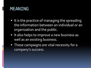 This document discusses ten public relations campaigns and their targeted audiences. It provides examples such as Dove's "real beauty sketches" campaign targeting women, Huggies' "TweetPee" device alerting parents when a baby's diaper is wet by tweeting, and Coca-Cola installing ATMs that dispensed free money encouraging people to help others. The document also discusses campaigns by Nokia, Ford, McDonald's, and others. The conclusion states that a well-planned PR campaign can benefit organizations of all sizes across various sectors.