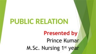 The document discusses the importance of public relations in nursing, emphasizing the establishment of good relationships between healthcare organizations and the public. It outlines the need for public relations to promote mental security, confidence, teamwork, and health information dissemination. Key elements and steps in public relations, along with various tools used in the process, are also presented.