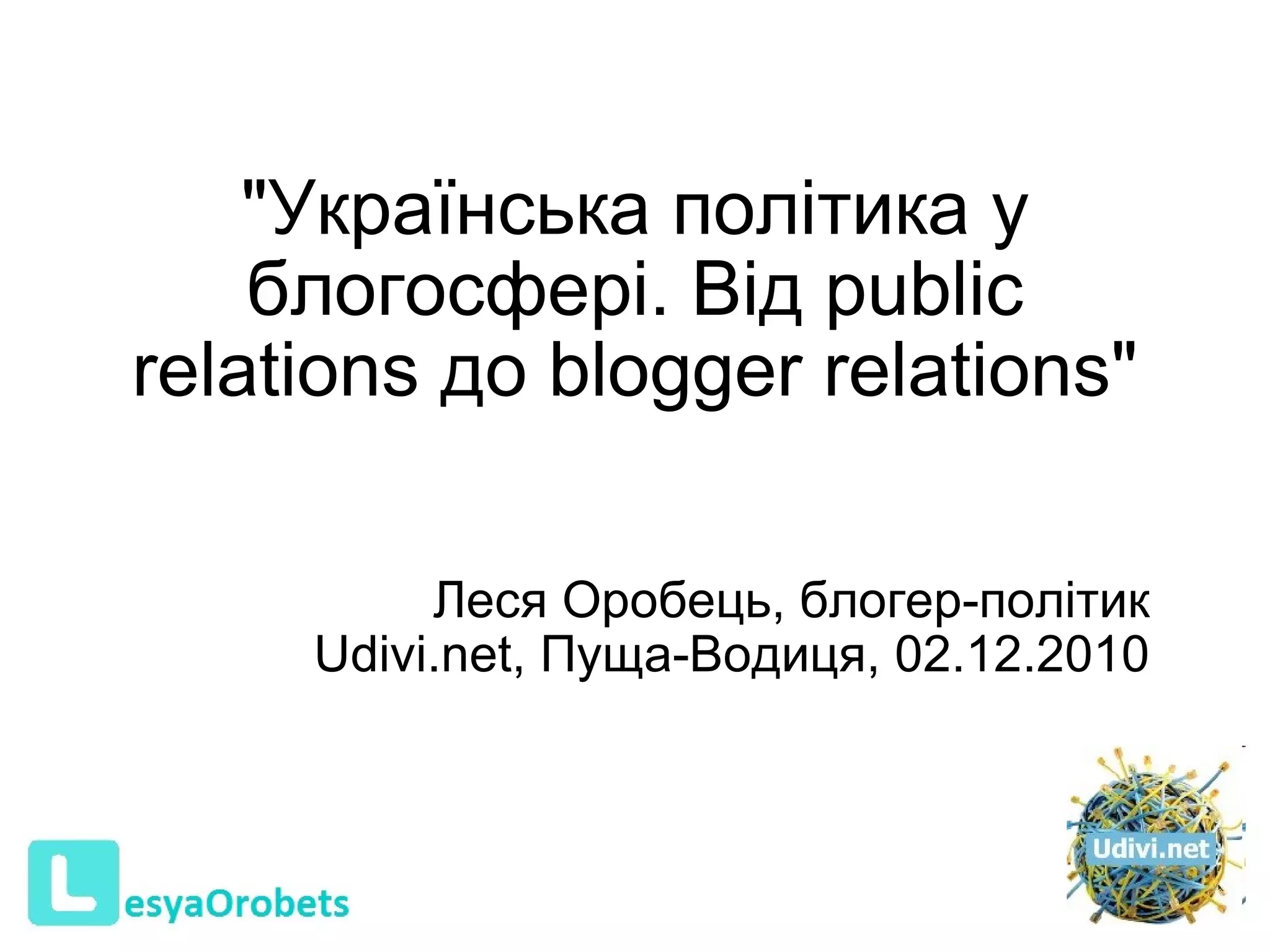 "Українська політика ублогосфері. Від public relations до blogger relations" Леся Оробець, блогер-політик Udivi.net , Пуща-Водиця, 02.12.2010