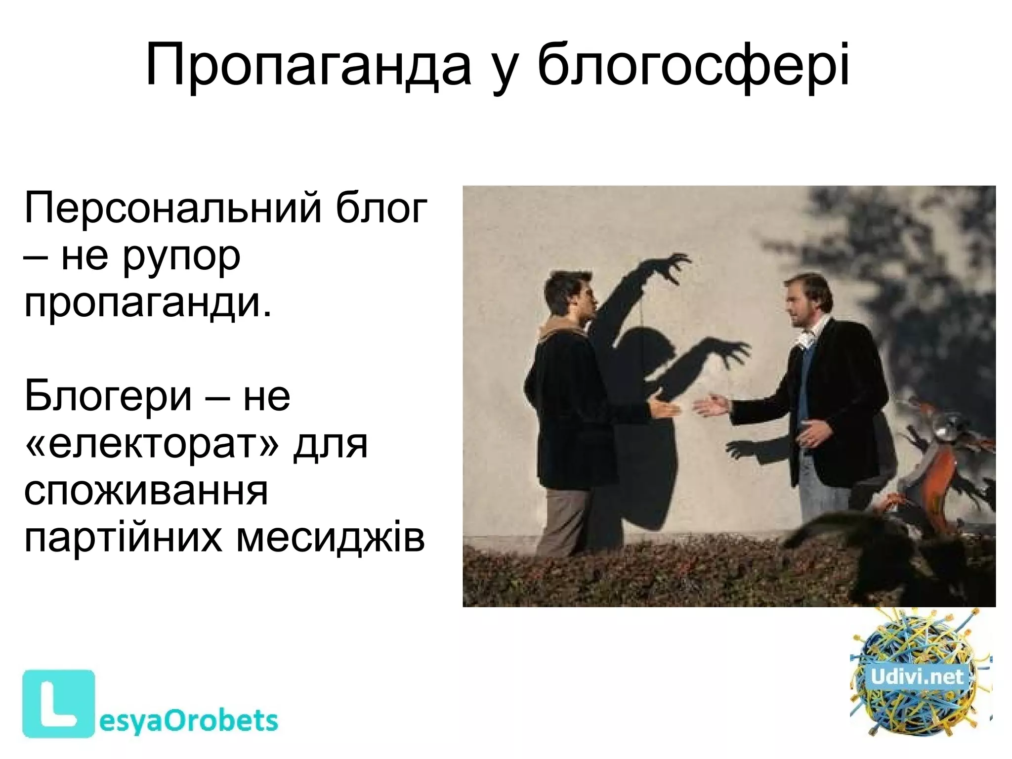 П ропаганд а у блогосфері П ерсональний блог – не рупор пропаганди . Б логери – не «електорат» для споживання партійних мес и джів