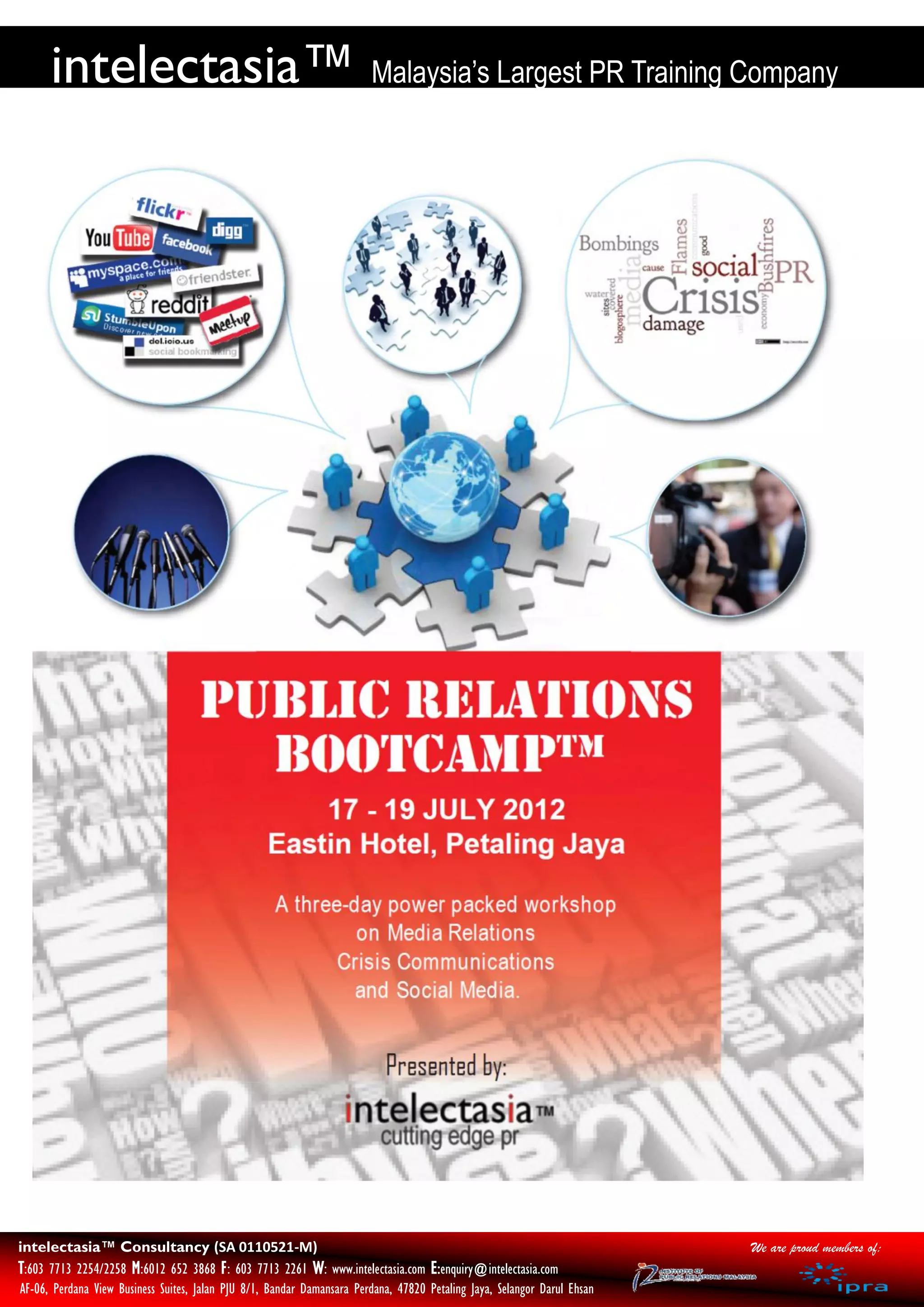 This document provides information about a 3-day public relations bootcamp hosted by Intelectasia, Malaysia's largest PR training company. The bootcamp will cover media relations, crisis communications, and social media, and will be presented by experienced journalists, editors, and PR consultants. Key highlights of the bootcamp include understanding Malaysia's current media landscape, building relationships with journalists, conducting press conferences and media interviews, leveraging social media for PR, and responding to media inquiries and negative news reports.