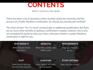 The document serves as a comprehensive guide for enrolling in the public relations certification course offered by the Nigerian Institute of Public Relations (NIPR). It outlines the eligibility criteria, stages of certification, course offerings, costs, and benefits, emphasizing the importance of public relations credentials for career advancement. Ultimately, it encourages individuals interested in a career in public relations or marketing communication to pursue the certification to enhance their skills and employability.