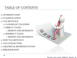 This document discusses public revenue sources for governments. It classifies revenue sources into tax revenue and non-tax revenue. Tax revenue includes direct taxes like income tax and indirect taxes like sales tax. Non-tax revenue comes from sources like profits from public sector undertakings. The document outlines various canons of taxation and analyzes the merits and demerits of direct and indirect taxes. It also provides data on tax collection in India from 1990-1991 to 2012-2013 and shows the increasing trend in tax revenue collection over time.