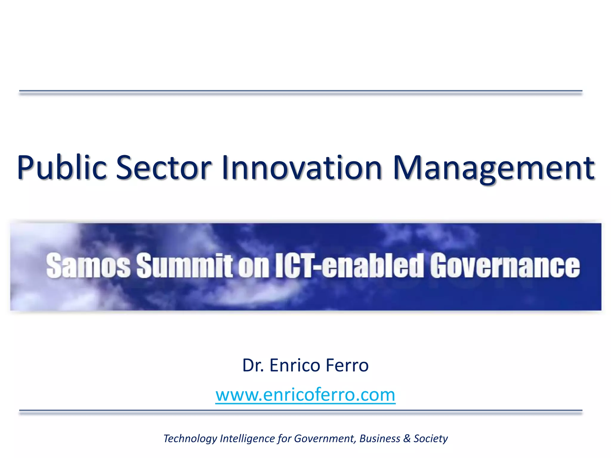 The document discusses the nature and categorization of innovation, emphasizing different dimensions such as product vs. process and radical vs. incremental changes. It highlights the importance of public sector innovation, identifying various types like service and policy innovation, and addresses challenges faced in implementing new ideas. Finally, it examines the role of technology, particularly ICT, in governance and smart city development to enhance efficiency and societal outcomes.