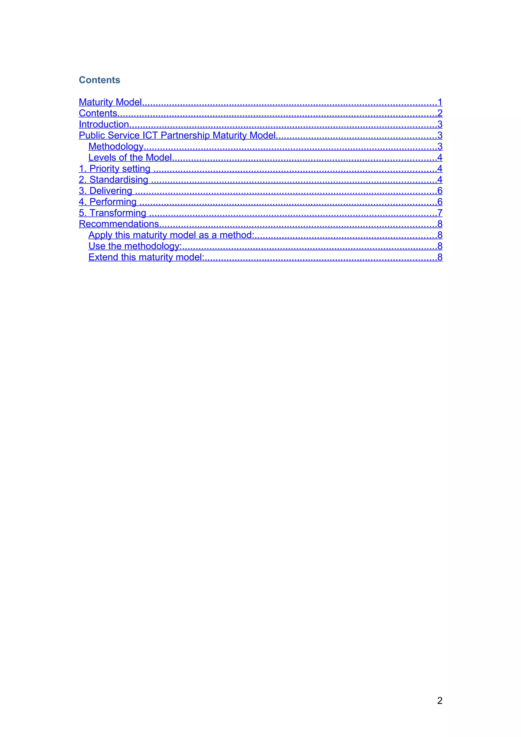 The document describes a maturity model for public service ICT partnerships. It outlines 5 levels of maturity: 1) priority setting, 2) standardizing, 3) delivering, 4) performing, and 5) transforming. For each level, typical processes, characteristics, and capabilities of partnerships at that level are defined. The document also provides recommendations for how the described partnership can apply the maturity model to benchmark itself and identify areas for improvement.
