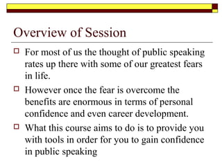 This document provides guidance on developing public speaking skills. It discusses overcoming the fear of public speaking by properly preparing for speeches through understanding the purpose, audience, key points, and environment. The document recommends getting to know the audience, generating ideas, and structuring speeches with an introduction, body, and conclusion. It also offers tips for delivery such as practicing, using note cards, maintaining eye contact, handling questions, and avoiding distracting behaviors. Resources for further developing public speaking abilities are provided.
