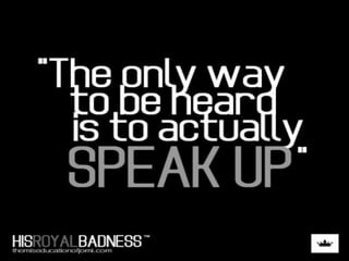 Public speaking involves addressing a large audience formally on a topic of general interest. It lacks the feedback and spontaneity of face-to-face communication due to the physical and psychological distance between the speaker and audience. Effective public speaking requires preparation including knowing the audience, choosing a topic, determining the purpose, collecting supporting materials, outlining the speech, and writing and practicing the delivery. Proper use of body language like posture, gestures, facial expressions and eye contact is important to complement the message during a public speaking presentation.
