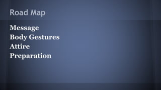 The document outlines key aspects of effective public speaking, including preparation, understanding the audience, body language, and attire. It emphasizes the importance of practicing, using gestures, and maintaining eye contact to engage the audience. Various online resources for further guidance on public speaking are also referenced.