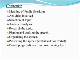 This document discusses the key aspects of public speaking, including selecting a topic, analyzing the audience, researching the topic, planning and drafting the speech, organizing the presentation, and delivering the speech to overcome fears. The main activities involved are choosing a suitable topic, understanding the audience, thoroughly researching the issue, creating an outline and speech materials, rehearsing, and presenting with confidence through eye contact, gestures, and audience engagement techniques.