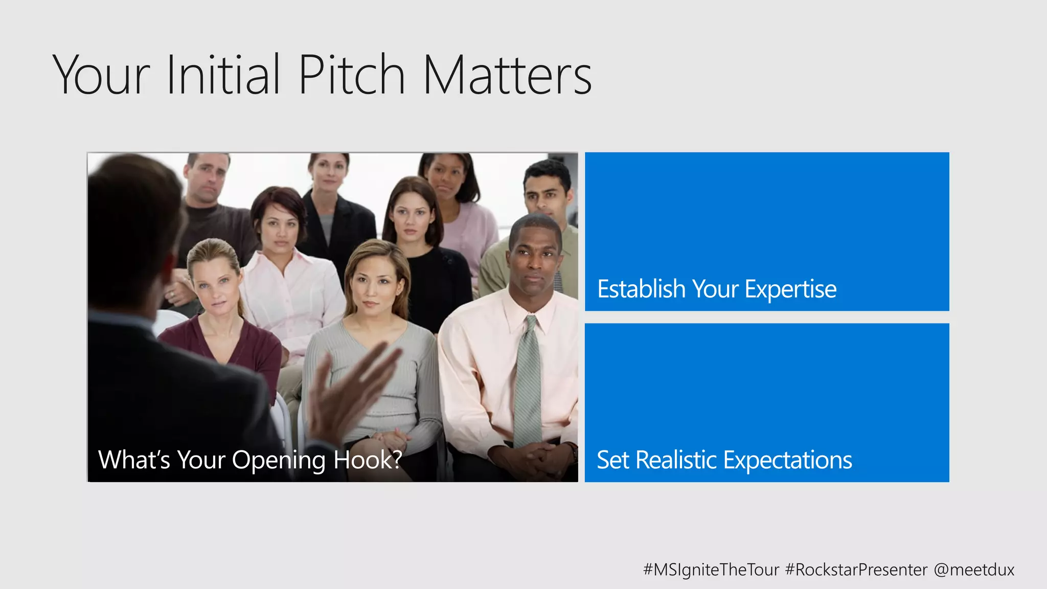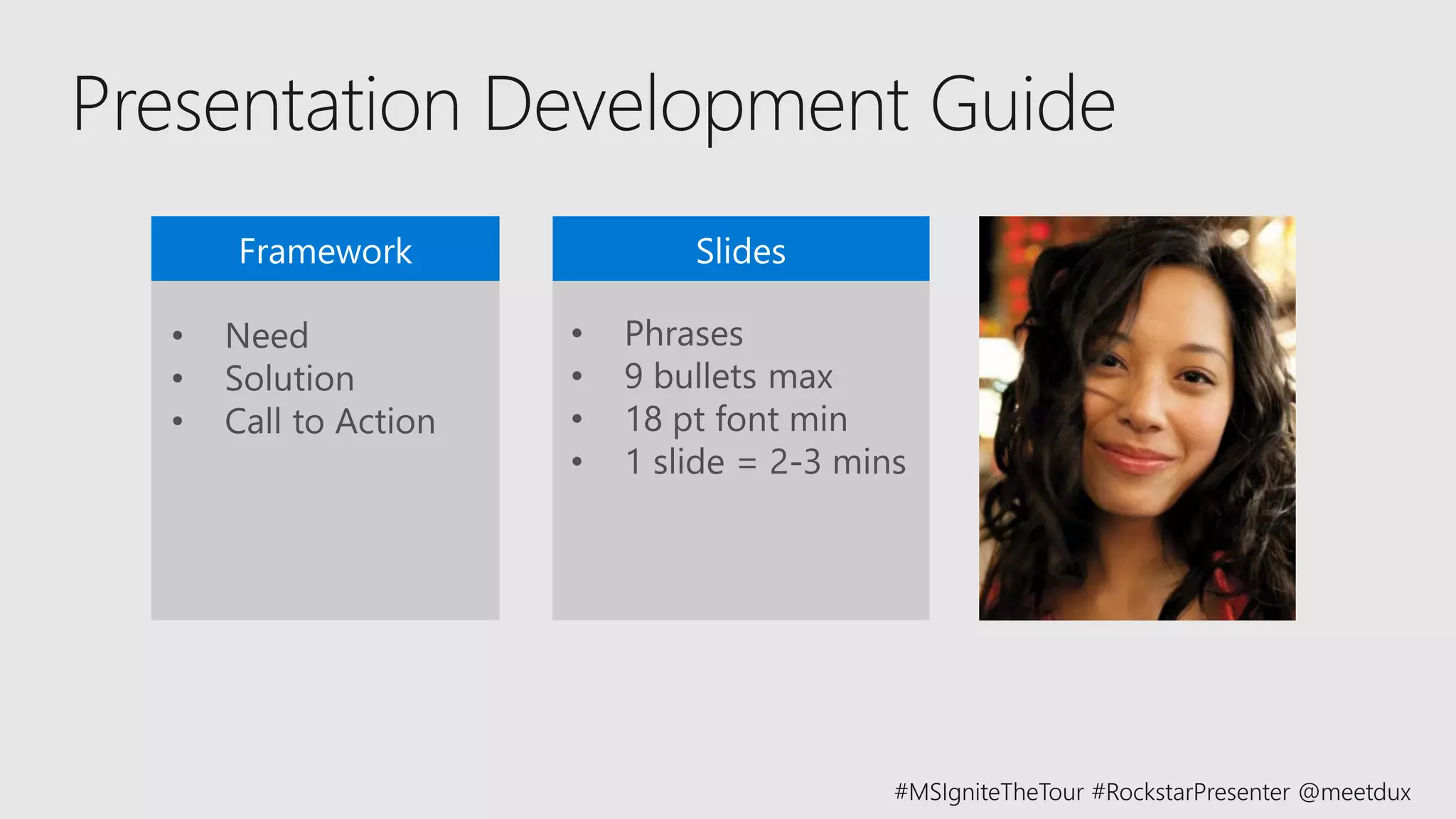 This document provides tips for effective public speaking. It discusses the roles of a presenter as persuading, motivating, and informing audiences. It then outlines a 5-step process for being a rockstar presenter, including developing a catchy abstract, using repetition to reinforce learning, conducting dry runs, minimizing speech issues, and summarizing with a call to action. Presentation content should stick to what's important and use visual highlights and repetition to aid retention.