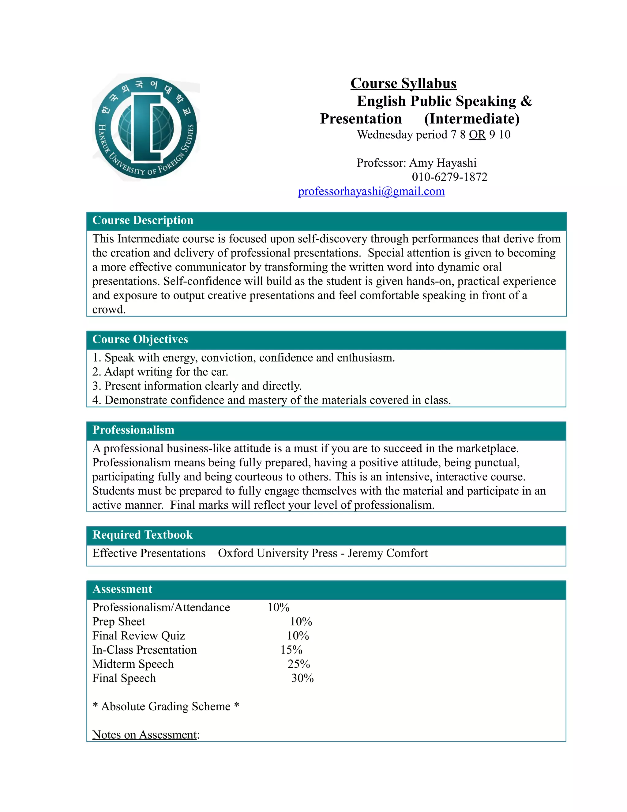 This document provides a syllabus for an intermediate public speaking and presentation course. The course will meet on Wednesdays and focus on building self-confidence through creating and delivering professional presentations. Students will learn to transform written work into dynamic oral presentations and speak comfortably in front of others. Assessment will include participation, preparation work, quizzes, in-class presentations, a midterm speech, and a final speech. Students must demonstrate mastery of materials, energy, and professionalism. Required reading is an effective presentations textbook.