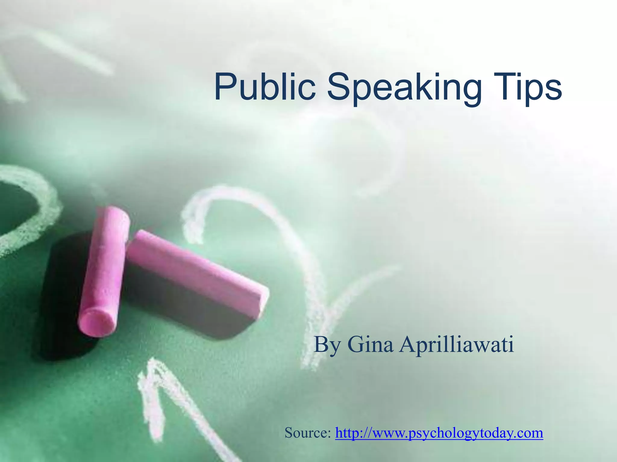 This document provides tips for public speaking. It recommends thoroughly preparing the speech by crafting it with a logical flow, stories, and examples. Practice the speech out loud until comfortable. Consider the audience and what information they want. Watch videos of other speakers to learn. If possible, visit the room beforehand to practice at the podium. Know your strengths and focus on them. Treat public speaking like a performance. Study transcripts of good speeches to learn techniques. Smile at the audience as they enter to feel relaxed.