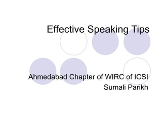 This document provides tips for effective public speaking. Some key tips include getting the audience's attention at the beginning, speaking with energy and using gestures, structuring the speech logically with a clear introduction, body, and conclusion. Visual aids, personal stories, humor, and maintaining eye contact with the audience are also recommended. The goal is to leave the audience with a clear message and something to think about after the speech.