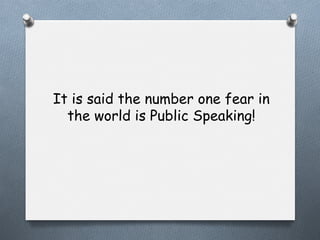 The document outlines a workshop on public speaking conducted by Abhishek Shetty, focusing on overcoming the fear of public speaking. Key tips include speaking from the heart, extensive preparation, creating a structured speech, and engaging with the audience through body language and humor. Strategies for speech day preparation and execution are also provided, emphasizing relaxation, audience awareness, and effective communication techniques.
