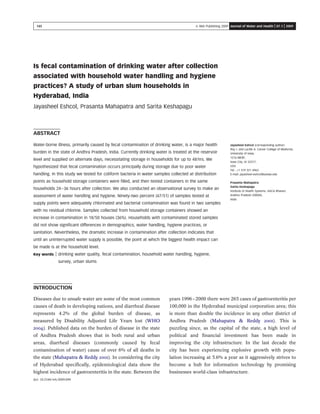This document summarizes a study that investigated fecal contamination of drinking water in urban slum households in Hyderabad, India. The study tested water samples at distribution points and from household storage containers to measure changes in water quality over time. It also conducted surveys of household water handling practices and hygiene. The results showed that while 92% of samples at supply points were adequately chlorinated, 36% of samples from household storage containers showed increased bacterial contamination. However, households with contaminated stored water did not significantly differ in demographics, water handling, hygiene, or sanitation from those without. This indicates that water quality deteriorates substantially between distribution and household storage, likely due to poor water handling and storage practices.