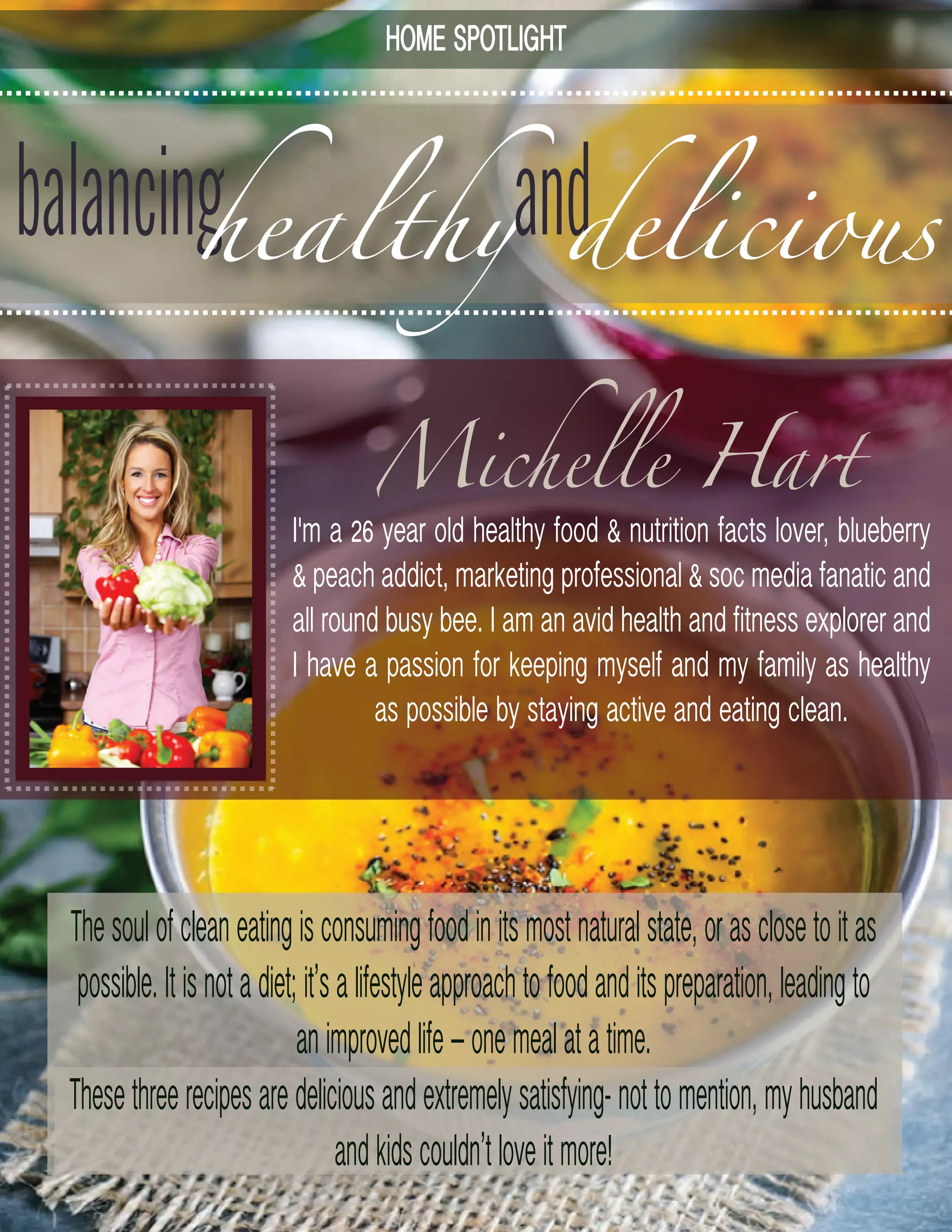 The document discusses a healthy food and nutrition blogger who shares her passion for keeping herself and her family healthy through staying active and eating clean foods in their most natural state. It then provides recipes for red lentil soup, a smoked mackerel salad, and paleo double chocolate cookies, all of which are described as delicious, satisfying options made from whole foods. The blogger indicates that her husband and kids love these recipes as well.