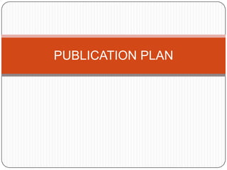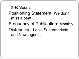 The document outlines a publication plan for a monthly music magazine titled "Sound". It will be distributed locally and have an informal style to appeal to readers aged 15-25. Each issue will include regular content such as editor and fan letters, reviews, competitions, and sneak previews of upcoming content. Feature stories will profile popular artists like Ed Sheeran, Ellie Goulding, and Gorillaz. The magazine will have a black, white, and red color scheme and use specific fonts for headlines, captions, and body text.