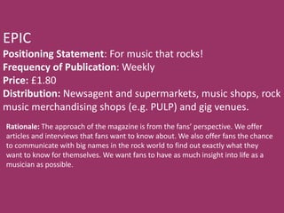 This document outlines a publication plan for a new weekly rock music magazine called EPIC. It will cost £1.80 and be distributed in newsagents, music shops, and venues. The magazine will target rock fans aged 14-25 with an informal style using humor, strong opinions, and simple language. Regular sections will include editor's letters, fan submissions, gig reviews, new music alerts, interviews, photos, tour diaries, album reviews, and playlists. Feature articles will profile upcoming releases and interviews with bands. The house style specifies fonts, formatting, and a color scheme for the magazine.