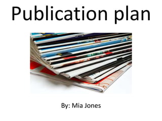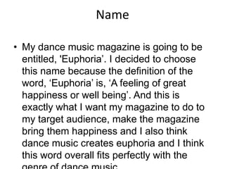 Mia Jones outlines her publication plan for a dance music magazine called "Euphoria". The magazine will be priced at £1.99 and sold biweekly at major supermarket franchises like Sainsbury's and Tesco to reach a wide audience. Its positioning statement, "Back by dope demand", references dance music slang and a popular song to appeal to readers. Each issue will include regular content like the masthead and price, as well as rotating featured articles, photographs, and graphics to provide new content. The goal is to make the magazine stand out while sharing interesting images and information about dance music.