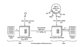 Dokumen ini membahas tentang prinsip-prinsip kriptografi kunci publik, termasuk struktur enkripsi dan komponen yang terlibat dalam sistem kriptografi kunci publik. Konsep utama mencakup penggunaan dua kunci yang berbeda untuk enkripsi dan dekripsi, serta aplikasi seperti tanda tangan digital dan pertukaran kunci. Selain itu, terdapat penjelasan tentang algoritma RSA dan langkah-langkah dalam generasi kunci serta proses enkripsi dan dekripsi.