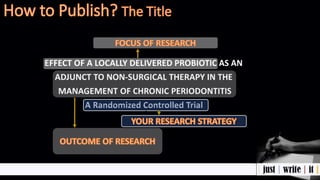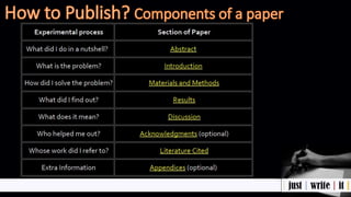 This document provides guidance for writing and publishing academic manuscripts. It discusses challenges authors may face including lack of familiarity with the publication process and becoming discouraged. It also discusses challenges with journals like space constraints and editorial priorities. The document provides tips for different sections of a manuscript like the introduction, methods, results, and discussion. It discusses referencing styles, matching manuscripts to appropriate journals, common reasons for rejection, and benefits of open access publishing for both authors and readers.