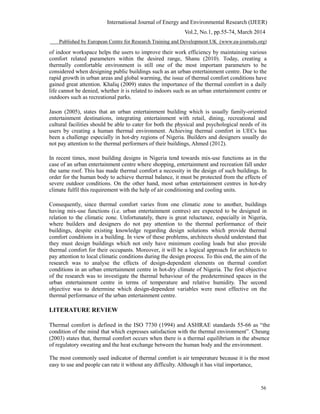 This document summarizes a study that evaluated thermal comfort conditions in an urban entertainment centre located in Nigeria's hot-dry climate. Data loggers were used to record temperature and humidity over time in different spaces to analyze how design elements like thermal mass, glazing size/type, and orientation impacted thermal performance. The study found that these factors most significantly affected thermal comfort. Simulations also showed that brick, double glazing, and larger north-south openings performed better thermally than other options. The results highlighted features that enhance thermal comfort and can be applied in future entertainment centre designs in hot-dry climates.