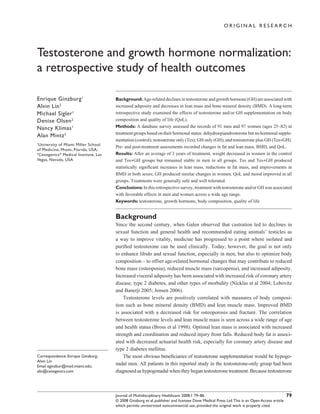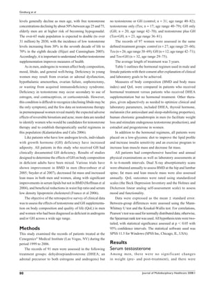1. A retrospective study examined the effects of testosterone and/or growth hormone (GH) supplementation on body composition and quality of life in 91 men and 97 women over an average of 3 years.