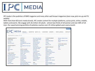 IPC media is a large UK publisher that produces over 60 magazines including NME, TV Weekly, and Teen Now. They engage with 26 million UK adults through their print, online, mobile, and event offerings. Bauer Media also reaches over 19 million UK adults per week through over 80 brands covering music, radio, TV and mobile interests. Specifically, they publish music magazines Kerrang, Q, Mojo, and 4Music. Q started in 1986 as a higher quality monthly music magazine focused on older audiences and expanded to radio and TV. Kerrang also expanded from its magazine roots into radio and TV focused on rock music. NME is a weekly pop/rock magazine published since 1952 known for its singles chart and association with