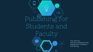 The document outlines the publishing process for students and faculty, highlighting key stages such as submission, review, and revision. It emphasizes the importance of understanding journal expectations, developing article sections effectively, and utilizing feedback loops to improve submissions. Additionally, it advises authors to manage multiple manuscripts and maintain a flexible approach to feedback in order to enhance their chances of publication.