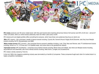 IPC Media produces over 85 print and digital media brands reaching almost 27 million UK adults. Their portfolio includes brands targeting men like Country Life and Horse & Hound, mass market women like Look and Chat, and upmarket women like Marie Claire and InStyle. IPC Media is wholly owned by Time Inc. Publishing houses in the mid-1950s were dominated by a few large companies competing for market share.