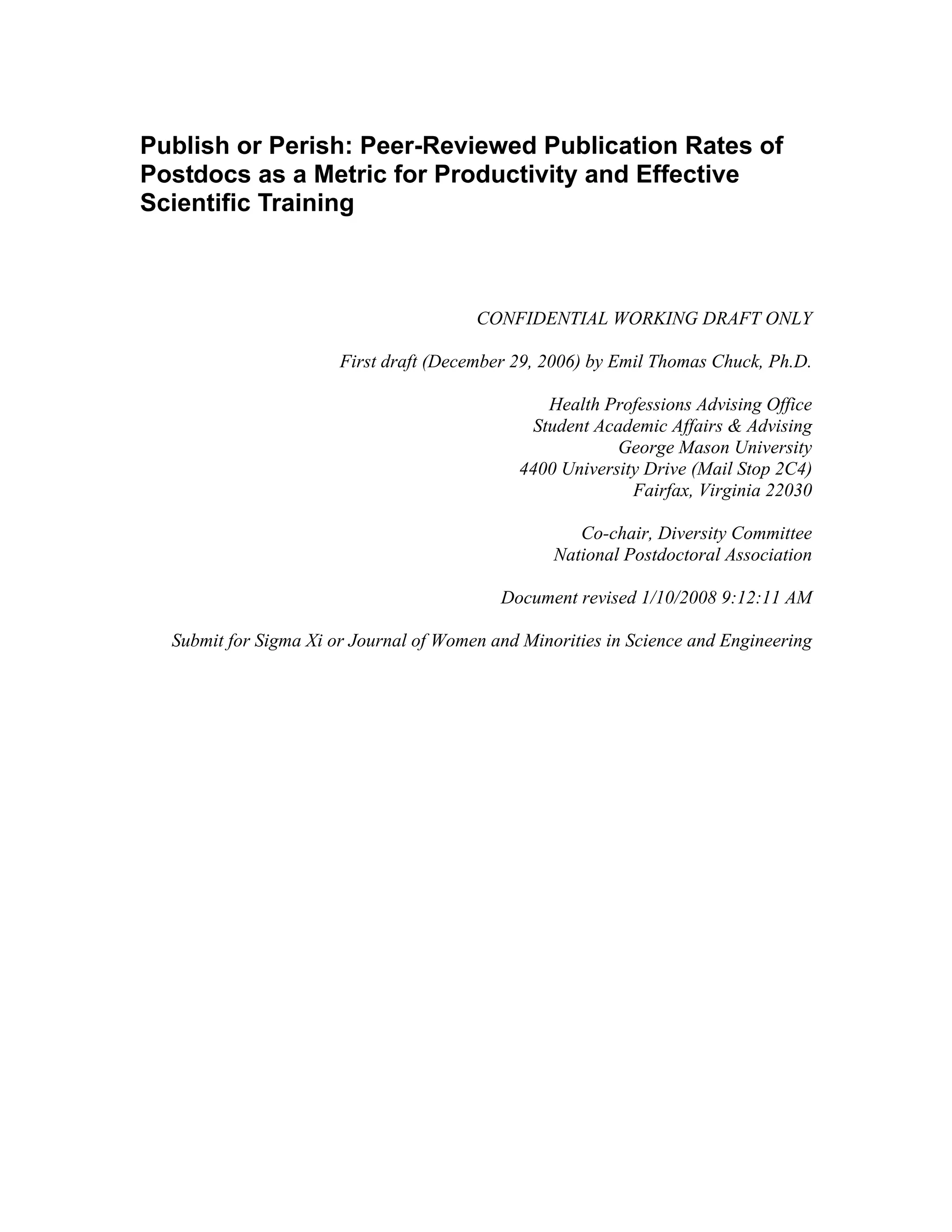 This document analyzes the peer-reviewed publication rates of postdoctoral researchers in the U.S., revealing that 38% of surveyed postdocs had not published any first-author papers, with an average of 2.3 papers among those who did. Notably, gender and ethnicity impacted publication rates, with men and certain minority groups publishing more papers, while formal mentoring was linked to higher productivity. The study emphasizes disparities in publication success in the context of the postdoctoral training system and the recruitment of women and minorities in academia.